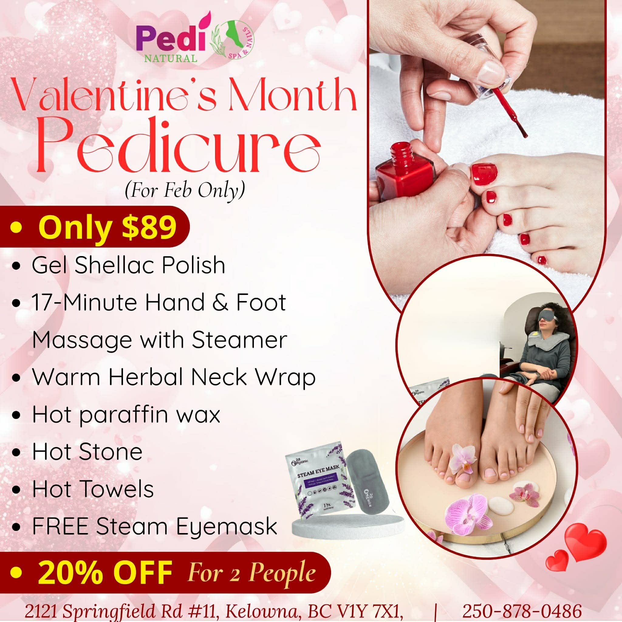 Posted on Kathleen MackenzieTrustindex verifies that the original source of the review is Google. Lovely relaxing professional pedicurePosted on Danielle LaidlawTrustindex verifies that the original source of the review is Google. A girlfriend and I just had the most beautiful experience at this spa!! From the moment we walked in the door until the moment we left we were so impressed! First class all the way! 👌🏼 Full leg/foot Massage/wax/calm relaxing atmosphere/top notch customer service… and the list goes on! 🥂 We definitely recommend and can’t wait to go back! ⭐️⭐️⭐️⭐️⭐️Posted on M DaviesTrustindex verifies that the original source of the review is Google. Yay, FINALLY I have found a place that does a great job. Just had a mani and pedi with Rose and Tina and they took their time, were gentle and pleasant. Happy to have discovered this little gem!Posted on Sheri CTrustindex verifies that the original source of the review is Google. Great experience thank you Cloe you did a great job 😊Posted on Chaitali PandyaTrustindex verifies that the original source of the review is Google. It was excellent expierence today ! Thank you Tina and Ien for the great pedicure , massage , facial and nails 💅 Mom and me both are so happy we will come again ! Friendly and hardworking staff !Posted on Teri WebberTrustindex verifies that the original source of the review is Google. Amazing! Great service, great price! Wonderful experiences.Posted on Anna CTrustindex verifies that the original source of the review is Google. Best pedicure I've had in Kelowna, in the three years I've lived here. Super clean atmosphere, great attention to detail and such lovely staff. I was greeted immediately, given some water and sat in a massage chair instantly. Highly recommend :)Posted on Danielle MillerTrustindex verifies that the original source of the review is Google. Very thorough and beautiful job.Posted on Pam SamaddarTrustindex verifies that the original source of the review is Google. This is about my 4th visit! I really enjoy the quiet, clean and spacious salon and especially polite and friendly staff. A little tricky is getting appointments with online booking system. Best to phone in. Thankyou to Vicki who stepped in for Hannah when shorthanded this am. Yen - love her pedicures! So relaxing!